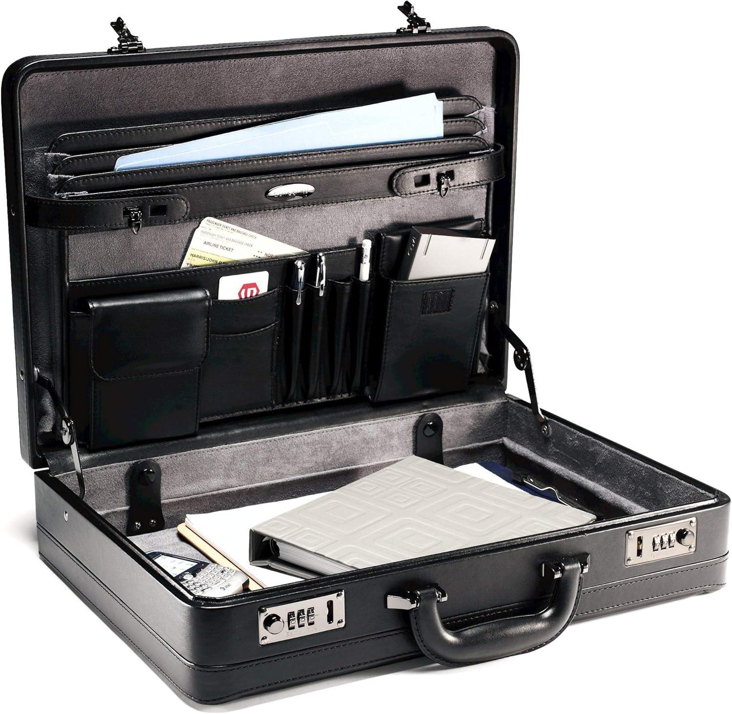 Expandable 3-tier, 4-file organizer; Padded top carry handle; Black nickel combination locks
